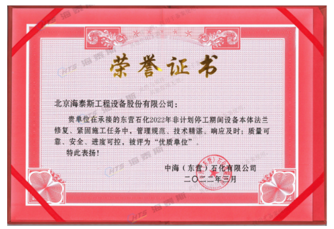 海泰斯獲評“優(yōu)質(zhì)單位”!負(fù)責(zé)的催化裝置、常減壓裝置泄漏法蘭的在線修復(fù)和定力矩緊固施工任務(wù),實現(xiàn)了“零泄漏”的目標(biāo)。